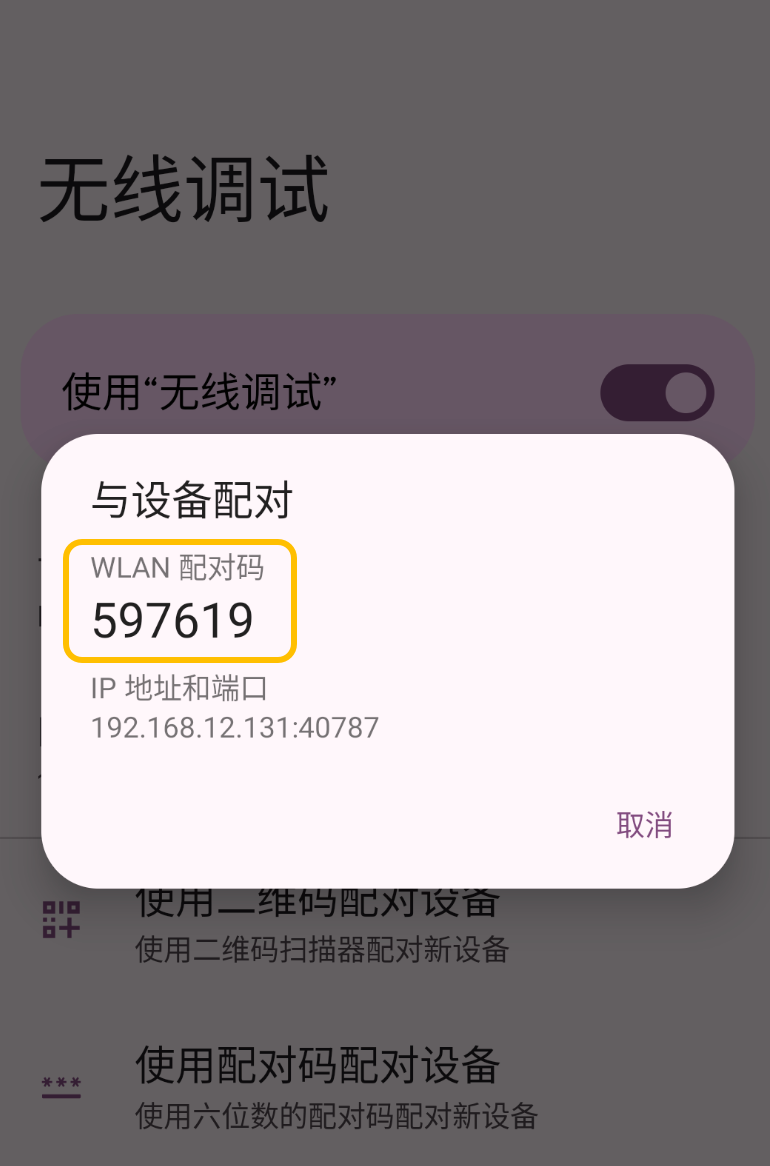 <HBuilderX安装目录>/plugins/launcher-tools/tools/adbs。如使用低于4.61版本的HBuilderX,需自定义高版本adb,选择自己的adb路径。 - 手机端的无线调试中,选择使用 配对码配对设备,找到您的 IP 地址、端口号和配对码。记下设备上显示的 IP 地址、端口号和配对码。